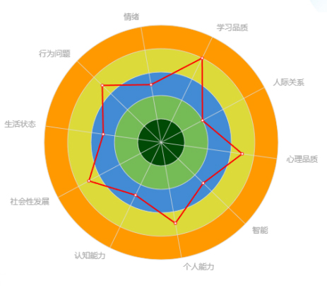 以雷达图的形式,将测试者在不同测评维度的得分进行对比展示,清晰呈现测试者在各维度的发展均衡程度。